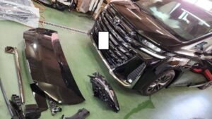 フロントバンパー・左ヘッドライト・ボンネット・左フロントフェンダーの交換部品を外していき、