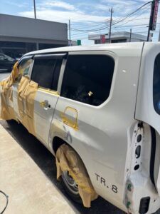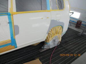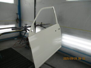 作業後、フロントドアと修理箇所の塗装作業をしていきました。