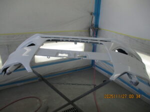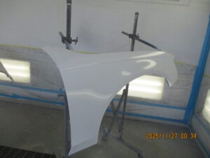 右ヘッドライトを外し、素地部品のフロントバンパーと右フェンダーパネルの塗装をしていきました。