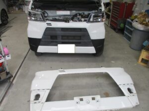 左ヘッドランプ・フロントバンパー交換部品を外して、ボンネットの修理をしていきました。